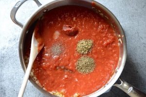 Pelar tomates maduros: hacer una incisión, enviar a 30 segundos en agua hirviendo, luego en frío y pelar fácilmente. Cortar los tomates pelados y picarlos en una licuadora. Difundir tomates picados en cebollas fritas, agregue sal, orégano, albahaca, pimienta molida, pasta de tomate y cocine salsa aromática, hasta no se volverá homogéneo y se espesará ligeramente.