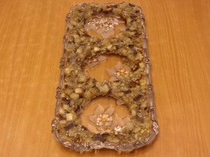 - Colocar en un plato rectangular con lados bajos. Una capa de berenjena.