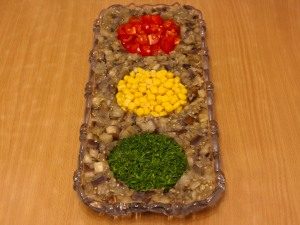 - Haz tres huecos en los que poner finamente picado tomates, maíz (escurrir el líquido), verduras finamente picadas.