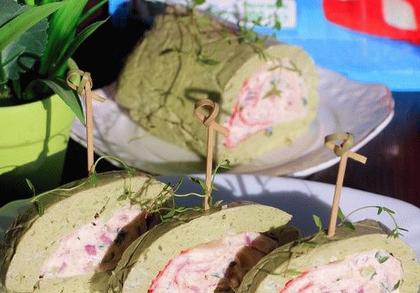 Elegante y sabroso aperitivo de palitos de cangrejo y aguacate decorará Cualquier mesa de vacaciones. La ventaja indudable para la anfitriona es que debe hacerse con anticipación y no el día de la presentación.