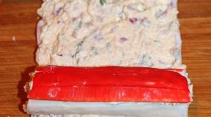 - Prepara el relleno para los palitos de cangrejo. Mezcle el caviar de lucioperca con requesón, cebolla finamente picada, hierbas.