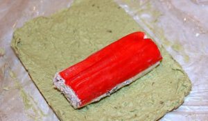 - En una mesa cubierta con film transparente, coloque una masa congelada de aguacate, rollo de palitos de cangrejo refrigerados con relleno.