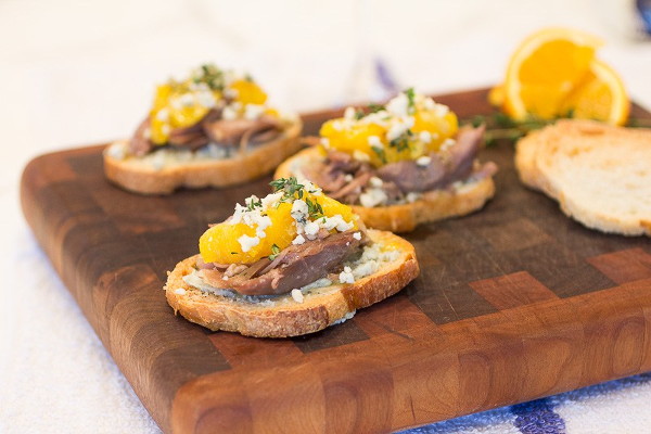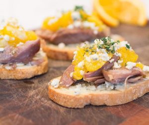 Un aperitivo original de vacaciones que no sorprenderá a los huéspedes. solo belleza, pero también un sabor único. Pan crujiente con hervido carne de pato, naranjas, queso azul y tomillo fresco – una obra maestra culinaria con la mezcla perfecta de productos que puedas cocinar en casa para las vacaciones.