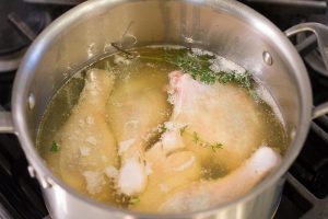 Piernas de pato lavadas y hervidas en agua con sal, una ramita tomillo y pimienta molida durante 2 horas, para que la carne se aleje libremente de huesos Enfríe las patas terminadas, sin piel y divida la carne. fibras en pedazos pequeños.