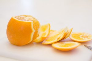 Pelar las naranjas y cortarlas en rodajas pequeñas.