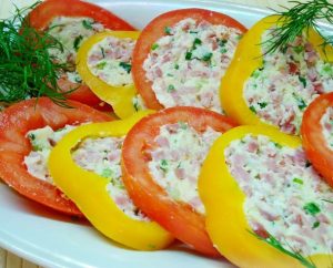 Brillante y sabroso aperitivo cocinado en casa con pimienta y tomates, decorar cualquier mesa de vacaciones.