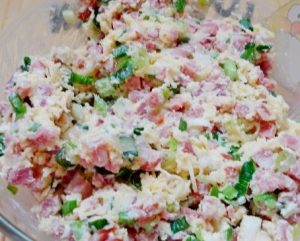 - Triture la cebolla, agregue a la salchicha y agregue la mantequilla.