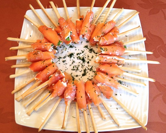 El delicioso aperitivo crujiente se cocinará en casa en la mesa festiva de salmón, queso crema y pajitas de pan. Tal La porción original de su pez rojo favorito sorprenderá a sus invitados. Hacerlo no es del todo difícil.