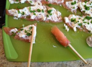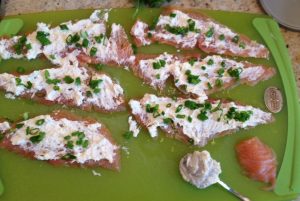 Corte el salmón (u otro pescado rojo) en rodajas, engrase queso crema y espolvorear con cebolla verde picada.