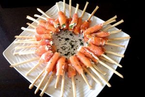 Las pajitas se colocan en el borde de una rodaja de salmón y se rizan suavemente, conseguir un pez en un palo. Usando este método, cocinamos todo salmón y pajitas.