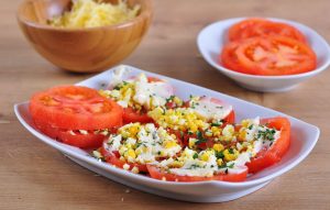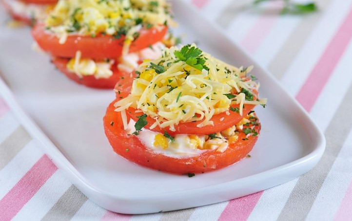 De tomates, huevos duros, queso duro, mayonesa y hierbas. Puedes cocinar un delicioso aperitivo en casa. No la hagas nada difícil Perfecto para una mesa festiva.