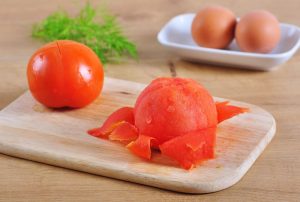 En la piel de los tomates, haga una incisión en forma de cruz, extendida en agua hirviendo y calentar durante 30-40 minutos. Sacamos, llenamos inmediatamente agua fría y luego quitar fácilmente la piel.