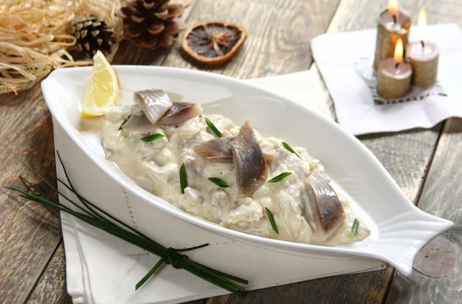 Pon el arenque en salsa blanca en un plato hermoso, agrega espolvorea las piezas restantes de arenque, espolvorea con cebollas verdes y sirve en la mesa de vacaciones.