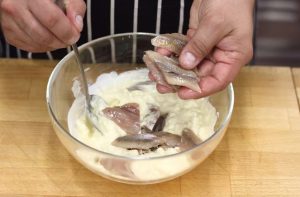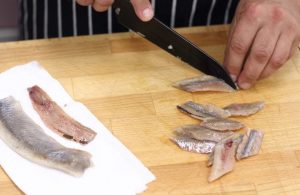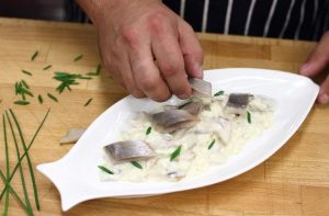 Filete de arenque salado (se puede tomar en aceite) cortado en pequeños piezas Picar la cebolla finamente.
