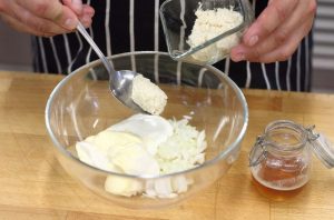 Ponga la cebolla picada preparada en un tazón, agregue crema agria, mayonesa, miel, rábano picante y mezclar bien.