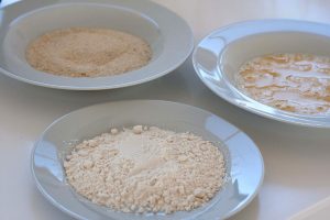 Lave el filete de bacalao y espolvoree con jugo de limón. 2 diferentes los platos vierten harina con sal, pimienta molida y pan rallado, y en Tercero batir el huevo con un tenedor.