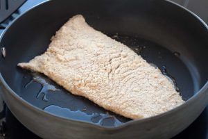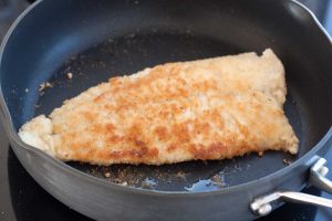 Freír las rebanadas de 2 lados durante 7 minutos, hasta que el pescado esté cubierto. corteza dorada crujiente.