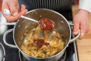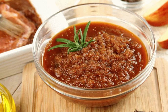 Caliente el aceite vegetal en una cacerola y agréguelo chalote en cubitos chalotes. Cuando la verdura esté casi lista, agregue azúcar y fría por otros 3-4 minutos. Después de eso agrega pimienta guisantes, manzana, rallada, canela, salsa de tomate y especias. Freír por otro 1 minuto.