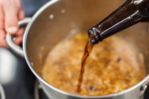 Después de eso, agregue jugo de manzana y cerveza a la olla, cocine a fuego lento todo por otros 10-15 minutos, hasta que la marinada comience a espesarse.