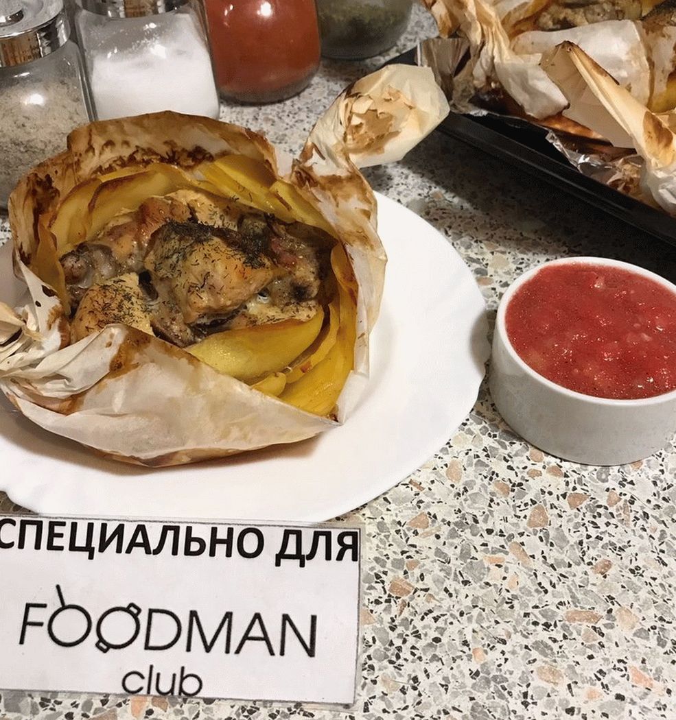- Del papel pergamino hacemos botes, ponemos papas y pollo, agregue y espolvoree con hierbas secas.