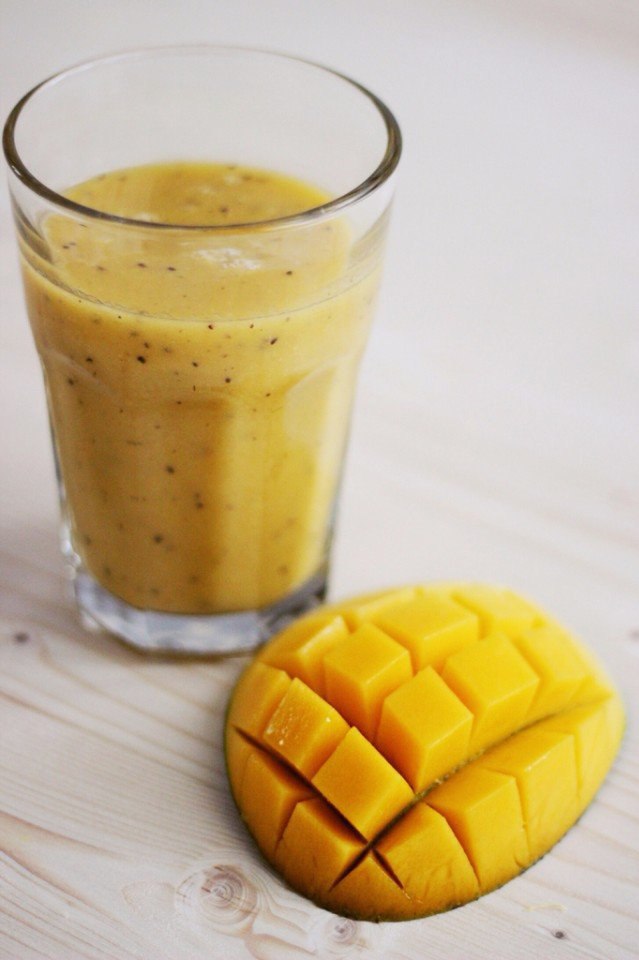 Refrescante y delicioso batido para restaurar la fuerza y la energía. Cocinar en casa con frutas tropicales.
