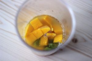 - Lavamos nuestras frutas, las pelamos. Las mandarinas se dividen en rebanadas y quita las venas. Dados de mango, kiwi, mandarina y vierte el jugo.