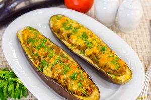 Receta para una cena ligera de berenjenas delicadas con carne jugosa carne picada El relleno puede ser de cualquier carne al gusto. También delicioso berenjenas rellenas se pueden cocinar para unas vacaciones en casa y servir como una merienda caliente Es fácil de preparar, se necesita tiempo para eliminar el amargor específico de la berenjena (30 minutos).