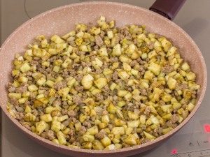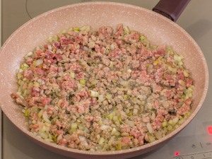 - Freír cebollas picadas y dientes de ajo aceite vegetal Agregue carne picada y fríalos juntos diez minutos