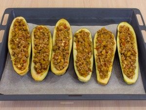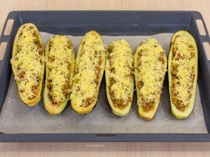 - Rellene las mitades de berenjenas preparadas con carne picada. Transfiera a una bandeja para hornear cubierta con papel de hornear, espolvoree queso duro rallado