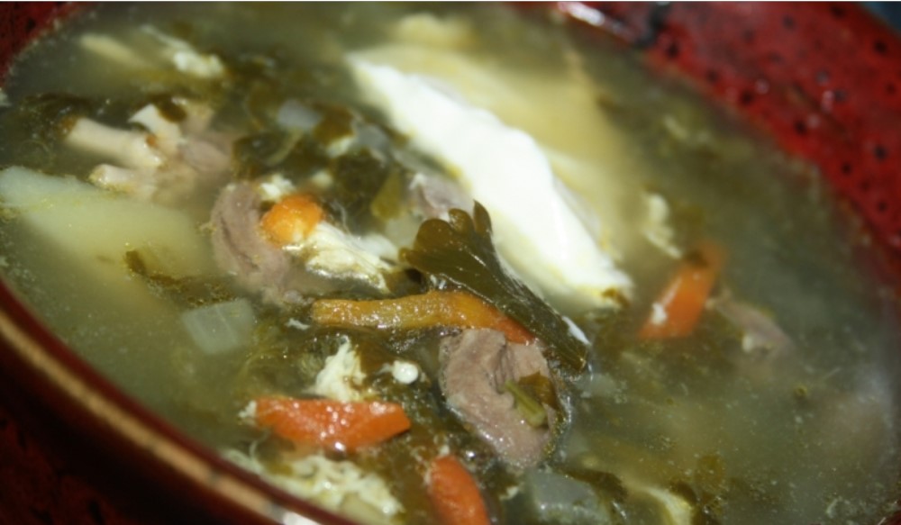 Delicioso borsch casero hecho de acedera y Corazones El sabor de la sopa se obtiene en primavera tierna y ligera. Estas sopas se sirven bien con pan de centeno y una cucharada de crema agria. de forma rústica Y si haces crutones de centeno con ajo, habrá Solo un cuento de hadas.