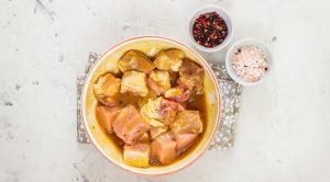 - Cortamos la carne en cubos grandes. Extendido en lo profundo capacidad, agregue todos los ingredientes para la marinada. Un plato de carne ponlo en el refrigerador por una hora.