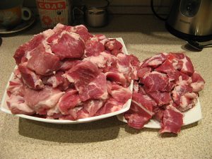 La carne de cordero se debe lavar, picar y cortar grande poner en una barbacoa, poner en un bol y agregar un poco de sal.