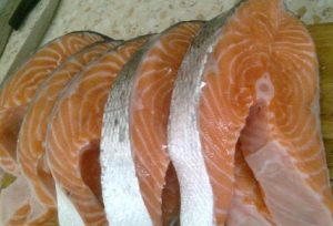 - Para la barbacoa, es mejor tomar la delantera del pescado. Cortar en filetes (la longitud debe ser de aproximadamente tres centímetros).