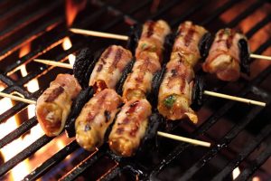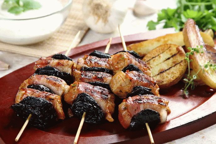 La receta de esta deliciosa brocheta de ternera con tocino y las ciruelas pasas son buenas para aquellos que no pueden usa la barbacoa, pero quiere cocinar de verdad Deliciosa barbacoa. Lo cocinamos en casa en una sartén a la parrilla. Y en la guarnición Te aconsejo que hagas papas de forma rústica.