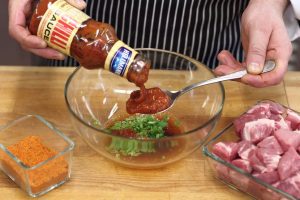 Pelar y cortar la ternera con un dado mediano. En lo profundo contenedores que necesita para mezclar salsa de tomate, condimento para carne y carne picada cilantro Pon la carne en la marinada y déjala aquí durante media hora.