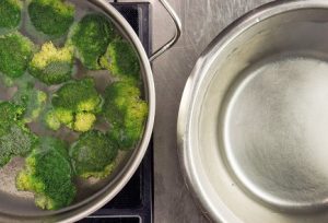 - Vierte agua con hielo en un tazón. Hervir el brócoli por dos minutos. desde el momento de hervir agua. Inmediatamente reclínese en un colador y extiéndalo en agua con hielo. Por lo tanto, el brócoli conservará su color brillante.