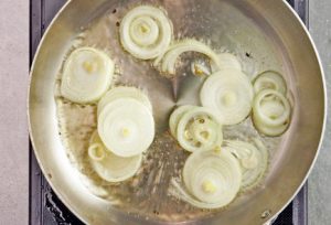 - En una sartén, calienta el aceite de oliva restante con semillas de sésamo Agregue la cebolla y fría por 5 minutos a fuego medio.