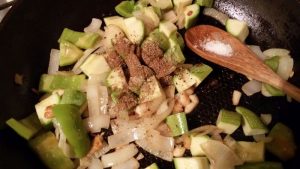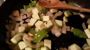 - Poner en una sartén a las verduras. Revuelva y cocine a fuego lento durante 3 minutos.