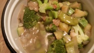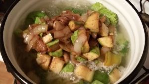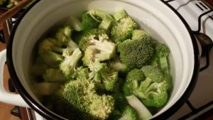 - Ponga vegetales en brócoli y papas. Cocine hasta que esté cocido verduras a fuego lento durante 10 minutos.