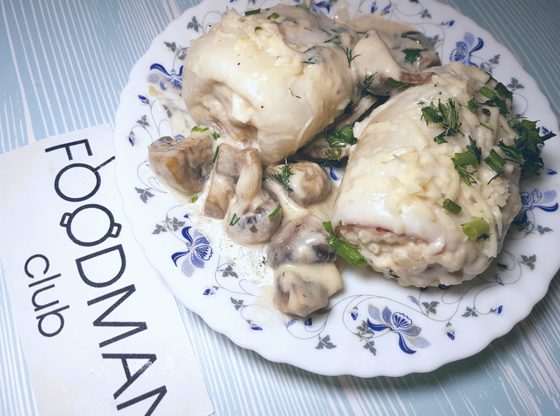 Deliciosos calamares rellenos de arroz y guisados en champiñones salsa. Puedes cocinar tanto para cada día como vacaciones