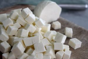 Cortar el queso Mozzarella en cubos pequeños (24 piezas).