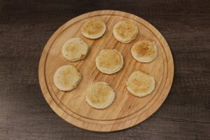 - Seque los círculos hasta que estén dorados en una sartén seca.