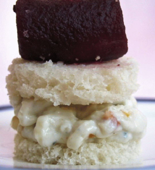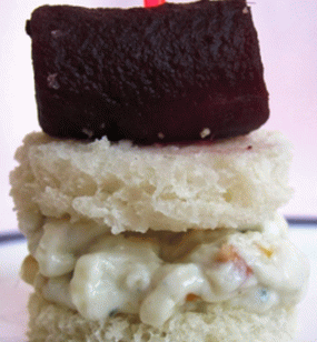 - Recoge los canapés. Ensarta una rodaja de manzana en un pincho, luego un trozo de pan, al final – pan con crema.