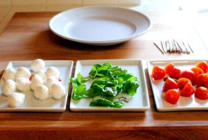 Corta los tomates cherry por la mitad, lava las hojas de albahaca y secar sobre una toalla. El queso mozzarella puede tomar una bola grande y cortarlo en trozos, pero con bolitas de aperitivo Se ve ordenado y muy hermoso.
