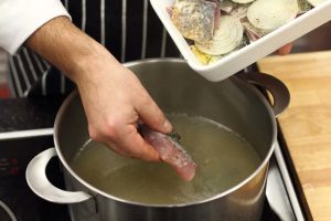 Ahora necesitas cocinar el caldo de pescado, para esto necesitas pelar todas las verduras, cortarlas en trozos lo suficientemente grandes, tirar en la sartén. Para las verduras también poner una cresta y una cabeza de pescado. Hervir el caldo durante 1 hora, luego colarlo con una gasa o un tamiz
