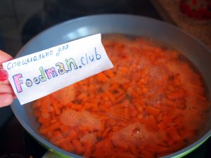 - Mientras se cocinan los cereales, procedemos a la preparación de verduras. Zanahorias cortar en tiras, poner en una sartén, verter agua (el agua debe cubra las zanahorias ligeramente), cierre la tapa. Cocine a fuego lento hasta hasta que las zanahorias se ablanden (unos 7 minutos).