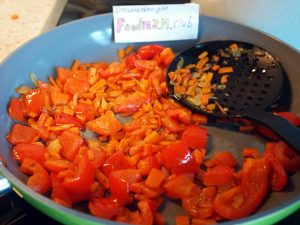 - Búlgaro antes de cortar en trozos grandes, picar la cebolla cubos Freírlos un poco en aceite vegetal (5 minutos). Agregue zanahorias, azúcar, sal, ají (lo tengo seco y muy fuerte, así que agregué una pizca completa, puedes usar fresco al gusto). Freír por unos 15 minutos. Las verduras deben convertirse suave y de tamaño encogible.