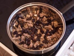 - Agregue ciruelas pasas, sal y pimienta al gusto, mezcle y cocina otros 7-10 minutos.