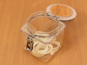 - Pon la cebolla y el ajo en el fondo de un frasco limpio.