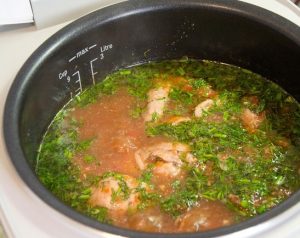 - 10 minutos antes del final nos quedamos dormidos en el bol del multicooker eneldo picado Puedes hacerlo con perejil o cilantro.